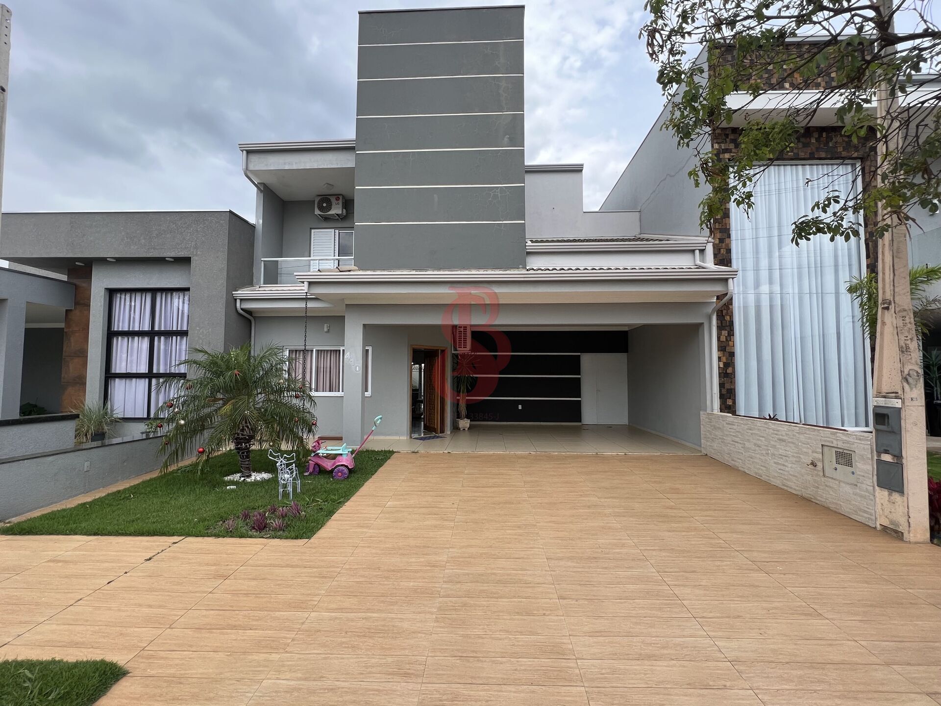 No piso inferior possui sala de estar integrada com sala de jantar e cozinha com armários, lavabo, área gourmet com piscina e quiosque, lavanderia coberta, garagem para 4 carros sendo 2 cobertos.