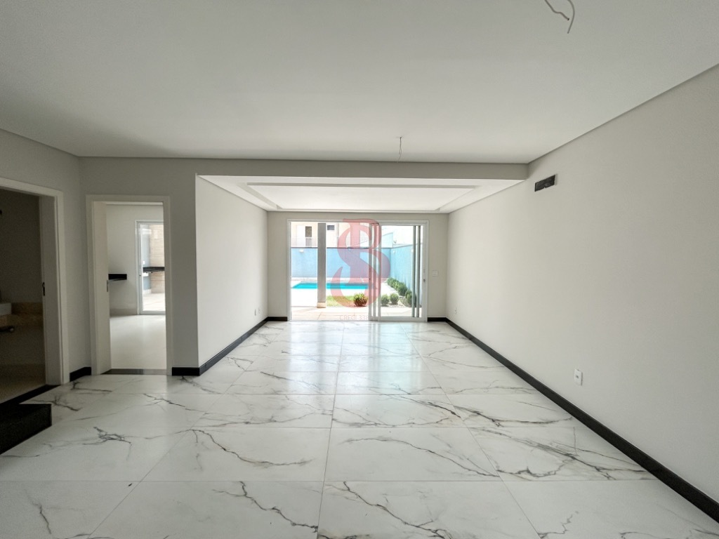 Sobrado 3 suítes com persianas automáticas, cozinha planejada, sala de estar e jantar integradas, lavabo, área gourmet com churrasqueira, piscina, lavabo na área externa, área de serviço, garagem.