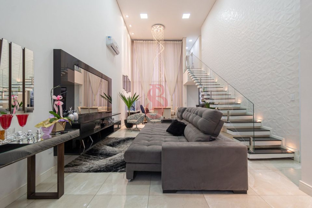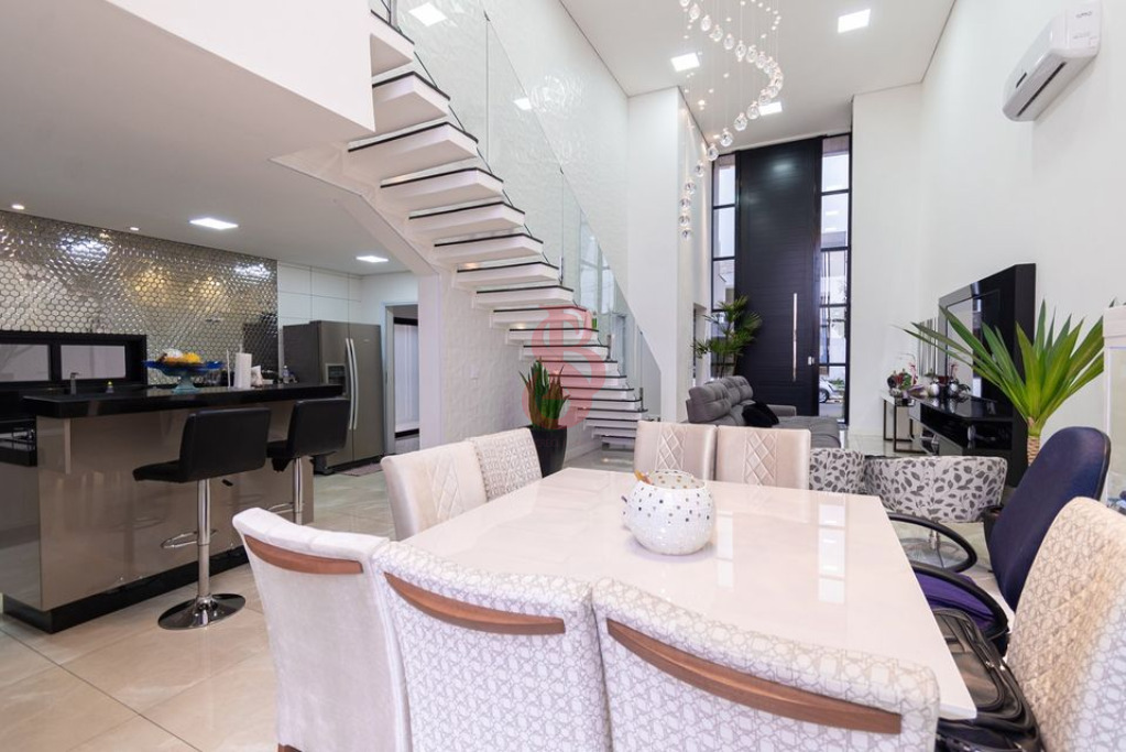 Sobrado com 3 suítes, closet armario planejado, sala de estar com maravilhoso lustre, sala de jantar, cozinha planejada com cooktop, despensa, banheiro social, lavanderia, área de serviço, espaço gourmet com churrasqueira e bar, lavabo, ofurô, garagem.